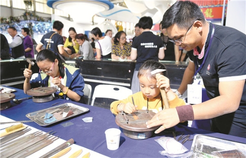 小朋友现场学习非物质文化遗产技艺。记者杨艳辉摄